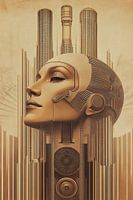 De illustratie toont een indrukwekkende Art Deco scène geïnspireerd op de futuristische esthetiek en stedelijke flair van Fritz Lang's "Metropolis". Op de voorgrond staat een vrouwengezicht dat zelfvertrouwen en vastberadenheid uitstraalt, terwijl ze in een dynamische pose staat die haar verbondenheid met de moderne wereld symboliseert.