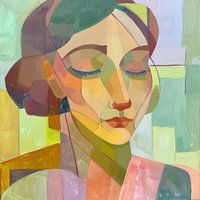 Dit prachtige schilderij vangt de essentie van moderne kunst door het gestileerde portret van een vrouw, afgebeeld in levendige geometrische vormen en zachte tinten. De harmonieuze compositie van oranje, groene en paarse tinten creëert een rustgevende en toch dynamische sfeer. Dit kunstwerk is ideaal voor woonkamers of kantoren en voegt…