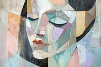 Dit prachtige kubistische portret van een vrouw combineert zachte pastelkleuren en geometrische vormen tot een harmonieuze en rustgevende compositie. De zachte gele, roze en blauwe tinten geven het beeld een warme en uitnodigende sfeer, terwijl de strakke lijnen en gesloten ogen van de vrouw kalmte en contemplatie uitstralen. Perfect…