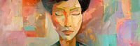 Dit heldere en kleurrijke kunstwerk toont een abstract portret van een vrouw. De levendige tinten groen, oranje en roze creëren een levendige en harmonieuze compositie die zowel rust als energie uitstraalt. De gesloten ogen van de vrouw en de gestileerde bloemen geven het schilderij een meditatieve kwaliteit die perfect is voor moderne…