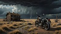 Mexicaans prairielandschap in onweersbui, een hut, een motorfiets