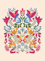 Dit Mexicaanse kunstwerk, geïnspireerd op het rijke culturele erfgoed van de Otomi, is een eerbetoon aan de natuur en presenteert een harmonieuze mix van complexe vogel- en bloemmotieven. Het doek explodeert letterlijk met stralende kleurtonen, van levendig rood en diepblauw tot levendig geel en groen, waardoor een levendige compositie ontstaat. Het nauwgezette ontwerp van op Otomi geïnspireerde patronen voegt een vleugje traditionele charme toe aan het kunstwerk, terwijl de sierlijk afgebeelde vogels en bloemen een gevoel van vitaliteit en natuurlijke schoonheid oproepen.