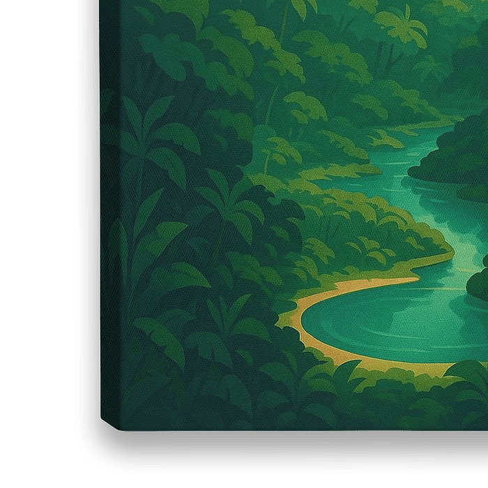De gedurfde Art Deco compositie balanceert organische vormen met geometrische precisie en transformeert de ruïnes in een icoon van eeuwige harmonie. Levendig groen en zonovergoten geel versmelten aarde en geest tot een rustig maar krachtig beeld.