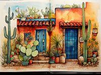 In een schetsmatig schilderij van Mexico domineren majestueuze cactussen het landschap. De grillige lijnen van de cactussen contrasteren met de zachte glooiingen van de woestijn. De kleuren variëren van het diepe groen van de cactussen tot de warme tinten van de woestijngrond. Het geheel ademt de kenmerkende sfeer van dit prachtige land uit, waar de natuur en cultuur naadloos samenkomen.
