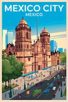 De prachtige gevel van een historisch gebouw rijst majestueus op te midden van pulserende straten, omringd door groene bomen en de drukte van de stad. De torens torenen elegant de lucht in, terwijl een blauwe lucht en moderne wolkenkrabbers een fascinerend contrast vormen op de achtergrond. Een fascinerend samenspel van heden en verleden in Mexico-Stad!