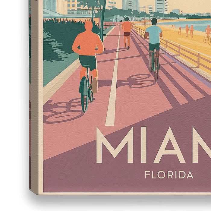 Een levendige wandeling langs het strand, omlijst door palmbomen en kleurrijke luchten, belooft een puur vakantiegevoel. De fietsers en wandelaars vangen de levendigheid van Miami terwijl de golven zachtjes kabbelen. Dit kunstwerk geeft elke woonkamer een ontspannen, uitnodigende sfeer en wekt het verlangen op naar zonnige dagen en…