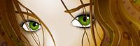 Deze vectorafbeelding toont een close-up van een gezicht met intens groene ogen die de kijker direct aankijken. Het gezicht wordt gedeeltelijk omlijst door bruin haar dat losjes over het voorhoofd en de ogen valt. De compositie is strak uitgesneden, waardoor het oog naar de ogen wordt getrokken - een centraal element dat spanning en aanwezigheid creëert.