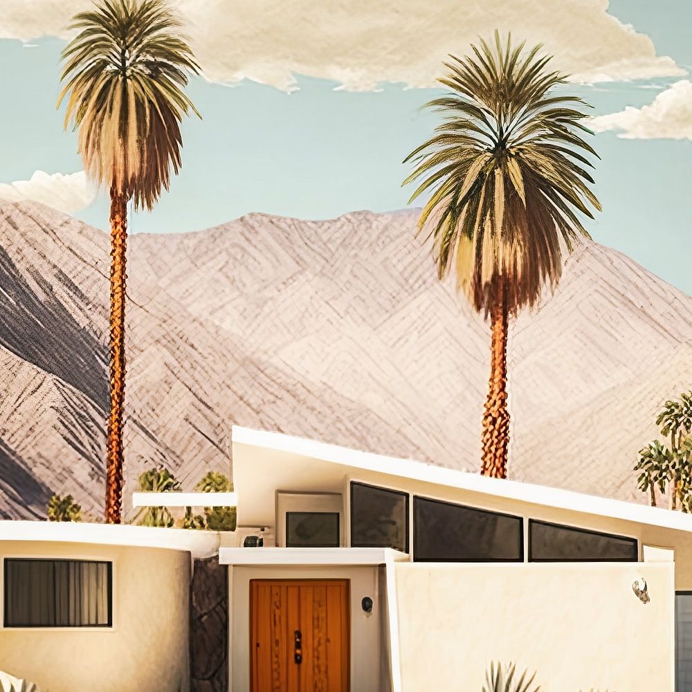 De afbeelding toont een prachtige mid-century modern bungalow, gelegen in een woestijnachtige omgeving met hoge palmbomen en een indrukwekkend berglandschap op de achtergrond. De architectuur van het huis straalt de iconische stijl van Palm Springs uit, met zijn strakke lijnen, een speels schuin dak en grote ramen die veel natuurlijk licht binnenlaten. De tuin is minimalistisch en droogtebestendig aangelegd met rotsen, agaves en andere woestijnplanten, wat perfect past bij het warme klimaat. De lucht is helder blauw met een paar zachte, schilderachtige wolken, wat een serene en nostalgische sfeer creëert.