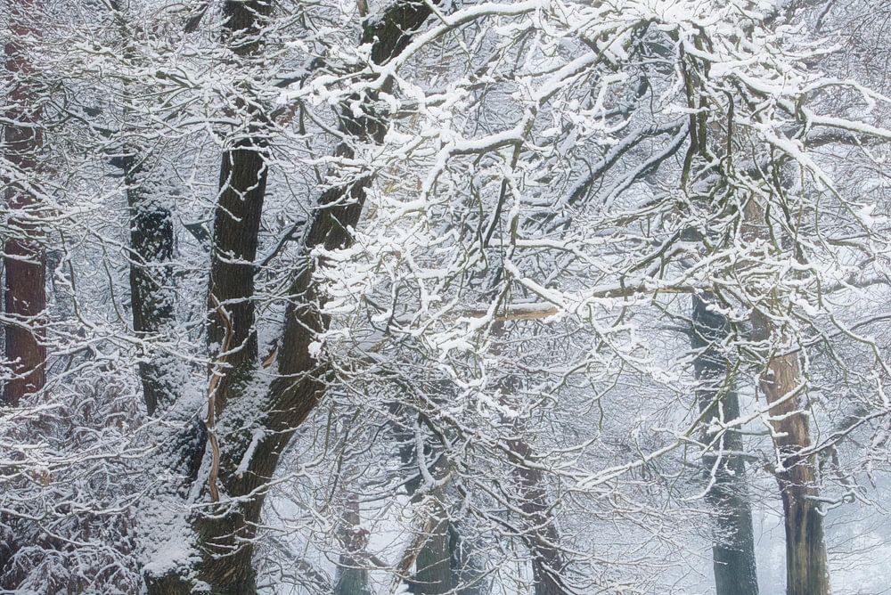 Deze foto werd gemaakt op een zeer koude januarimorgen. De wereld was in sommige delen van het land veranderd in een winterwonderland en de atmosfeer was zo stil en sereen, dat het bijna surrealistisch was. Één van de eerste taferelen die ik deze dag fotografeerde was dit tafereel met kleine bomen. De takken die bedekt waren met sneeuw en rijp leken wel fijn kantwerk en dat trok me direct aan. Dichte mist onttrok de grote dennenbomen op de achtergrond aan het zicht, maar toch zijn ze nog enigszins zichtbaar.