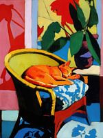 Een levendig schilderij in expressionistische stijl van een oranje kat die vredig ligt te slapen op een rieten stoel met kussens. De scène baadt in kleurrijk zonlicht, met gewaagde schaduwen en een potplant op de achtergrond die bijdragen aan de warme, gezellige sfeer.