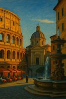 Onder de zachte Romeinse zon staat het Colosseum in stille majesteit - niet als een overblijfsel uit het verleden, maar als onderdeel van een levende, ademende stad. Licht valt door de bogen en verlicht de warme okerkleurige muren van nabijgelegen gebouwen en de zachte nevel van een fontein die de lucht vangt als verstrooid glas. Aan de…