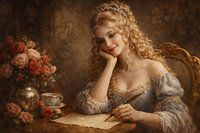 Het schilderij toont een jonge vrouw met een romantische uitstraling, zittend aan een houten tafel. Ze is halverwege het schrijven van een brief op een vel perkament met een klassieke veerpen. Haar houding is dromerig; ze rust met haar kin op haar hand en kijkt met een subtiele glimlach en helderblauwe ogen peinzend in de verte, alsof…