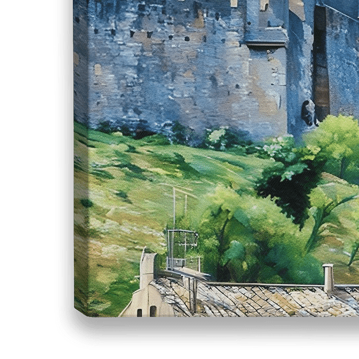 De afbeelding toont een majestueus middeleeuws kasteel met imposante stenen muren en torens tegen een achtergrond van een helderblauwe lucht met pluizige witte wolken. De grijze stenen gevel van het kasteel'is verweerd en versleten, wat duidt op zijn leeftijd en geschiedenis. Weelderig groen gebladerte omringt het kasteel en voegt…