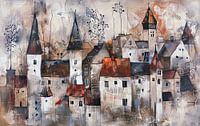 Een abstracte voorstelling toont een stad met rustieke gebouwen en hoge, smalle torens. Aardse bruine, beige en gedempte rode tinten komen samen om een vrolijke maar levendige sfeer te creëren.