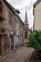 Een middeleeuws straatje met uitzicht op een kerkje in Franse havenstadje Honfleur.