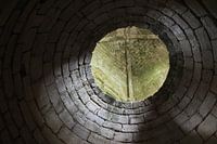 Binnen in een middeleeuws kasteel in Frankrijk, kijkend naar een interessant abstract uitzicht op architectuur en steenwerk, het licht valt precies goed om het gat te verlichten
