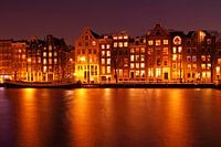 Middeleeuwse huizen langs de Amstel in Amsterdam bij nacht