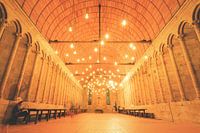 Prachtige opname van het interieur van middeleeuws monument historique Le Mont Saint-Michel in Bretagne, Frankrijk, met een mooie zaal met lichtjes aan het plafond