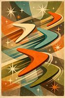 Een levendige, abstracte poster in mid-century modern-stijl met iconische boemerangvormen en atoomsterren in retro kleuren. Dit kunstwerk is geïnspireerd op het ontwerp uit het atoomtijdperk van de jaren 50 en geeft een dynamische vintage stijl aan moderne interieurs, woonkamers en creatieve ruimtes.