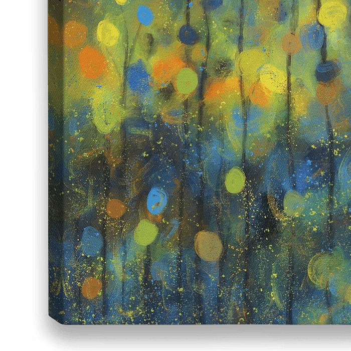 Een levendige mix van kleuren creëert een abstract boslandschap met boomachtige vormen die omhoog reiken. Verlichte cirkels, stippen en verfspatten suggereren iets magisch tegen een diepblauwe nachthemel.