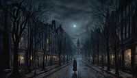 Ontdek de mystieke allure van een tijdloze nacht in Middernacht op de Verlaten Straat. Dit kunstwerk neemt je mee naar een verlaten stadsstraat, verlicht door een ijzige maan die door een bedekte hemel breekt. De silhouetten van kale bomen werpen spookachtige schaduwen over de geplaveide straat, terwijl de gotische architectuur van de gebouwen een gevoel van nostalgie en mysterie oproept.