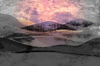 Een abstract landschapsschilderij van organische geometrische bergvormen en middernachtzon met een lichte expressionistische textuur in de kleuren warm bruin, ivoor, grijs, warm grijs, koper, goud en beigebruin met een impressie van Scandinavische kunst uit Noord-Europa.