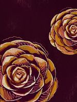 De originele kleuren van de bloemen zijn in het werk vaak aangepast, met een knipoog naar het origineel. Zo is de bloem zelf hier paars met oranje, maar zijn er veel roze details toegvoegd in de kleur van de echte bloem.