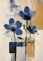 Midnight Bloom Clash - Dit bloemen schilderij toont abstracte, gedurfde blauwe bloemen tegen een achtergrond met texturen in gouden, witte en zwarte tinten, waardoor een modern en dynamisch gevoel ontstaat.