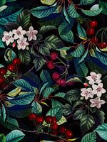 antieke handgeschilderde kersen en bloemen en bladeren op zwarte achtergrond