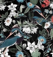 Een collage van vintage, tropische, botanische afbeeldingen van vogels, vlinders en planten, op een zwarte achtergrond.