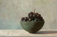 Midnight Harvest - Dit stilleven schilderij toont een rijke verzameling druiven in een donkergroene, met goud gespikkelde kom, geplaatst op een subtiele grijze ondergrond onder een zacht, diffuus licht.