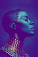In profiel, met gesloten ogen, straalt deze vrouw een diepe rust uit. De koele paarse en blauwe tinten geven het beeld iets mysterieus, terwijl de gouden halsringen en subtiele patronen op haar huid verwijzen naar een rijke, bijna koninklijke geschiedenis. Een beeld over identiteit, trots en stille aanwezigheid.