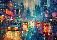 Midnight Pulse Submerge - kleurrijk stadsleven schilderij, natte stadsweg, reflecterende lichten