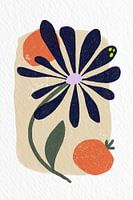 Op dit werk zie je een grote, donkerblauwe bloem met lange, afgeronde blaadjes die zich als een waaier openen. De bloem staat tegen een zachte, lichte achtergrondvorm, met twee speelse oranje vormen eromheen die doen denken aan vruchten.
