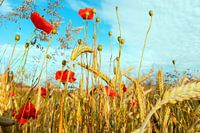 Midsummer bladeren geel als goud en trek de rode papaver op grote schaal in het hele land in de velden. Natuurlijke bloemen impressie van het zomerseizoen.