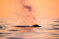 Op deze specifieke avond was de zee zeer kalm, er was nauwelijks wind en de laagstaande zon creëerde een prachtig kleuren palet. Deze bultrug ademde net krachtig uit voordat hij weer onderdook voor een nieuwe hap voedsel.