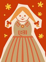 Hier presenteer ik mijn kleurrijke retro-illustratie in Mid Eeuw Moderne stijl, geïnspireerd door Scandinavisch design. Een minimalistisch, geometrisch kunstwerk van een vrouw in warme beige, gele, oranje en okerkleuren met een vleugje vintage op een beige achtergrond.