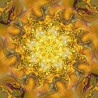 Een abstract samenspel van spiralen, in vele kleurschakeringen tussen wit, geel en oker, gebaseerd op een foto van de bloem van een rhododendronstruik.