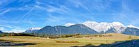 Panorama van het zonnige en sneeuwvrije Miemingerplateau met het Miemingergebergte op de achtergrond in de winter, Tirol, Oostenrijk.