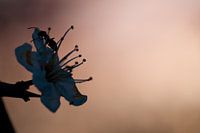 Een mier op de bloesem tijdens zonsondergang. De zonsondergang geeft de dromerige roze achtergrond, terwijl de mier er als een zwart silhouet op de bloesem tegen afsteekt.