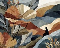 Botanische fantasie illustratie in aardetinten met het silhouet van een man dagdromend in de natuur.