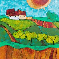 Het vrolijke landschap voor elke kamer in huis. Acryl met een reliëfoppervlak, geeft een levendig spel van licht en schaduw, decoratief kunstwerk in een eigentijdse minimalistische stijl,