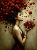 Stap binnen in een wereld van tijdloze schoonheid en surrealisme een betoverend olieverfschilderij waarin een vrouw centraal staat. Haar serene profiel, met gesloten ogen en een kalme uitdrukking, straalt rust en gratie uit. Haar weelderige haar vloeit over in een explosie van dieprode rozen, waarvan de bloemblaadjes zachtjes rond haar…