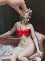 Oneerbiedigheid en verleiding transformeren de context van een neoklassiek schilderij in een speelse collage die de kijker uitnodigt om een nieuw perspectief binnen het kunstwerk te verkennen met een vleugje humor en een vleugje provocatie.