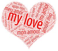 Woordhart in de vorm van een hart met My Love in tien verschillende Europese talen. Een cadeau voor je liefde, voor Valentijnsdag, voor een jubileum of een huwelijk, of misschien gewoon voor de romantiek.