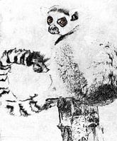 Digitale tekening van een ringstaartmaki, zittend op een boomstam en houdt z'n eigen staart vast. Dit werk is ook leuk voor in de kinderkamer.