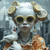Een bijzonder en mooi jong meisje, met een porseleinachtige huid, breekbaar en apart. Lijkt op een standbeeld maar is het niet, met het fruit in haar witte haren en haar grote gele ronde zonnebril, de kip op haar schouder is haar vriendje. Oranje en geel zijn haar lievelingskleuren, het fruit, de bril, de oorbellen, haar jurk en haar…