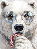 Witte ijsbeer met bril die zuurstok eet, kerstkunstwerk