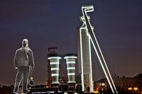 Fotomontage van een zwart-witfoto van een mijnwerker met een kleurenfoto van de kolenmijn Schlägel und Eisen in Herten
