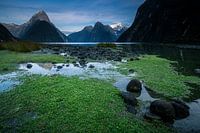 Milford Sound bij laagtij. Milford Sound is een groot en beroemd fjord in het Zuidereiland van Nieuw-Zeeland.
